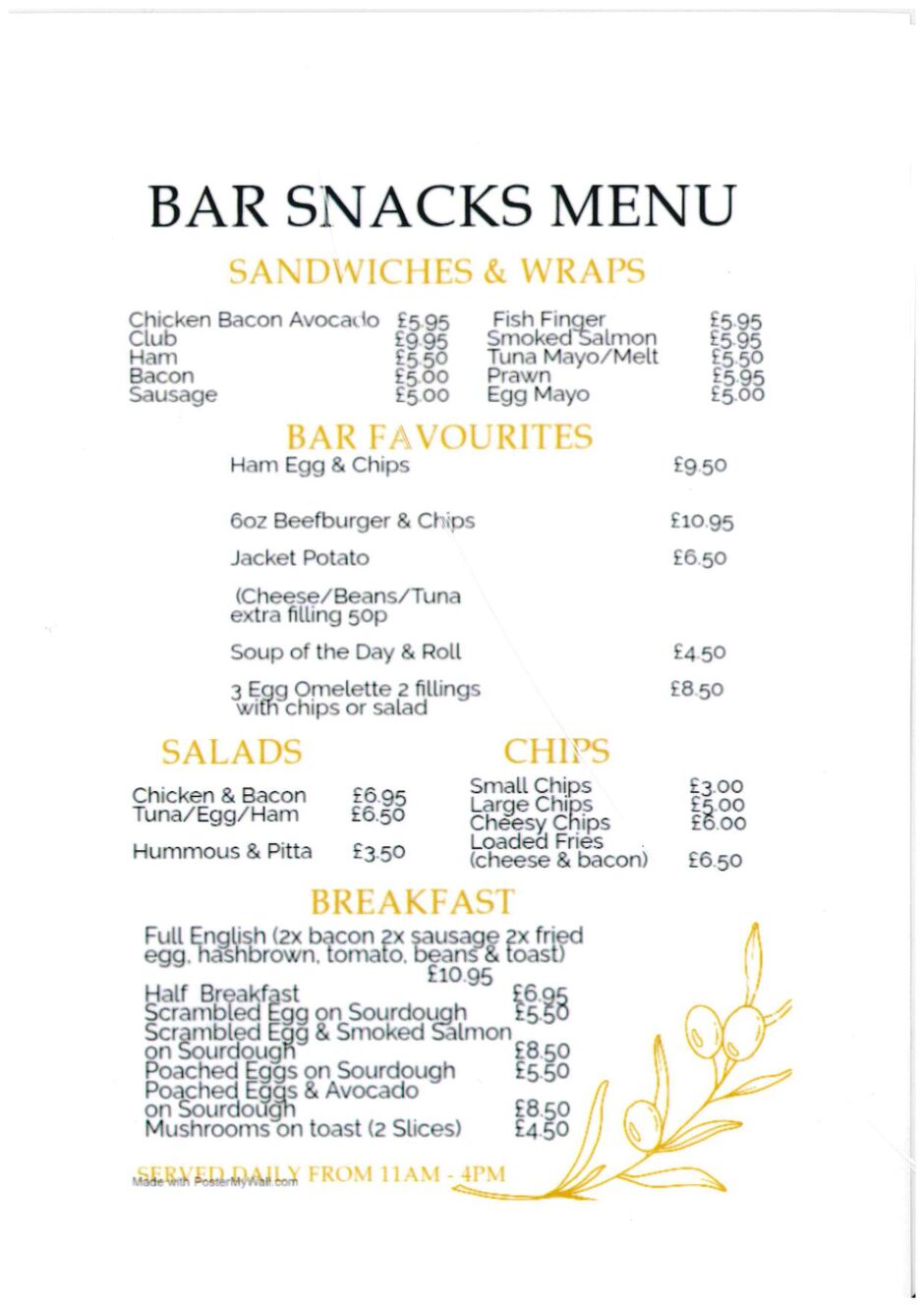 Bar Snacks are served Tuesday - Sunday 11am-4pm